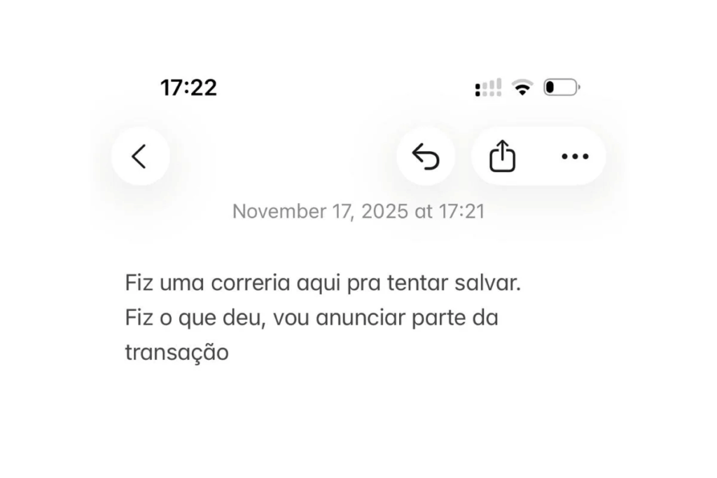 Às 7h19 de 17 de novembro de 2025, quando tentava embarcar para Dubai, Vorcaro escreveu: “Fiz uma correria aqui para tentar salvar. Alguma novidade? Conseguiu ter notícia ou bloquear?”. A pessoa com quem ele se comunicava respondeu com três mensagens de visualização única, que não puderam ser recuperadas.