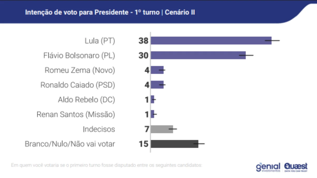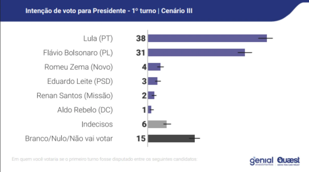 A pesquisa testou sete cenários de primeiro turno. O cenário mais apertado para Lula é o sétimo, em que ele aparece com 39%, contra 35% de Flávio, 4% de Eduardo Leite (PSD), e 2% de Renan Santos (Missão) e Aldo Rebelo (DC). Pela margem de erro de dois pontos percentuais para mais ou menos, existe um embate técnico no limite da margem neste cenário.