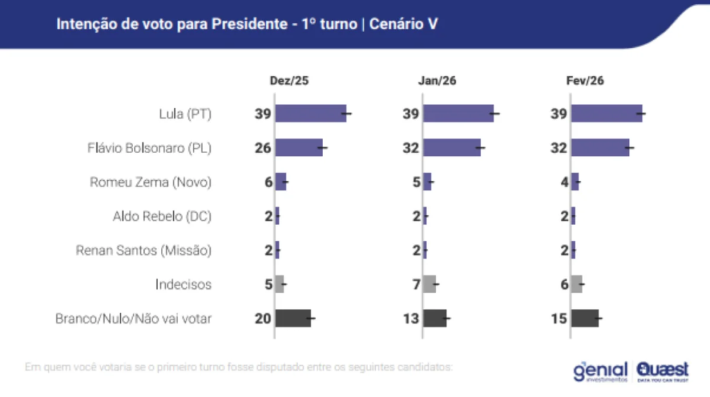 O levantamento foi encomendado pela Genial Investimentos e ouviu 2.004 pessoas entre os dias 5 e 9 de fevereiro. A margem de erro é de 2 pontos para mais ou para menos, e o nível de confiança é de 95%. No TSE, a pesquisa tem o registro BR-00249/2026.