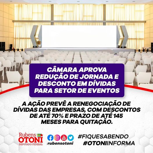 O deputado também trabalhou pela aprovação da redução de jornada e desconto em dívidas para o setor de eventos que foi fortemente atingido pela crise econômica causada em decorrência da pandemia. A iniciativa prevê a renegociação de dívidas das empresas, com descontos de até 70% e prazo de até 145 meses para quitação de dívidas.