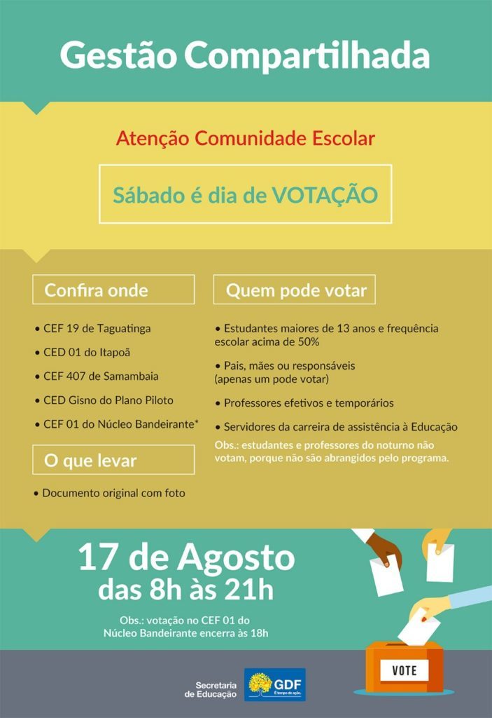 Neste sábado (17) cinco escolas do Distrito Federal vão ter processo eletivo para decidir se entram ou não no modelo de gestão compartilhada. O modelo, que unifica a gestão das escolas entre a Secretaria de Educação e a de Segurança Pública, já é realizado em cinco escolas do DF. A mais recente, e que também passou pelo processo seletivo, foi a Centro de Ensino de Planaltina, onde a comunidade escolar decidiu por optar pela modelo de gestão compartilhada.