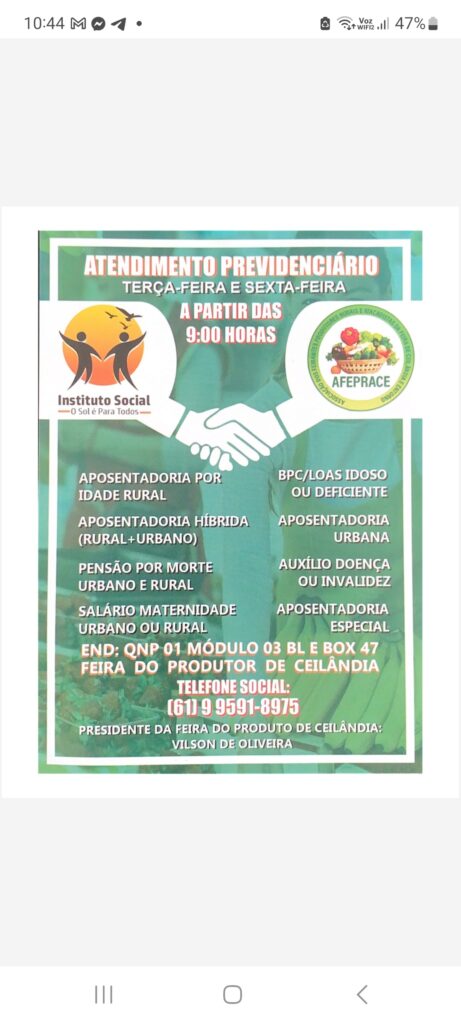 Agora, com o “Sol é para todos”, a ideia é fazer o mesmo. Segundo detalha o advogado, o projeto vai assessor os feirantes e seus familiares sobre demandas relacionadas ao direito previdenciário, como a aposentadoria por idade rural, aposentadoria híbrida (rural e urbano), pensão por morte urbano e rural, salário maternidade urbano ou rural, aposentadoria urbana, auxílio doença ou invalidez e aposentadoria especial.