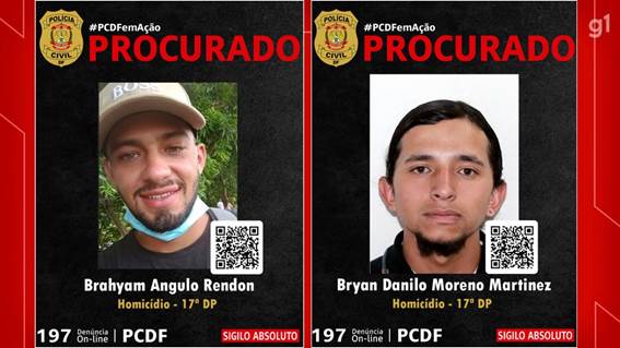 Brahyam Angulo Rendon (à esquerda) e Bryan Danilo Moreno Martinez (à direita) seguem foragidos. — Foto: PCDF/Divulgação