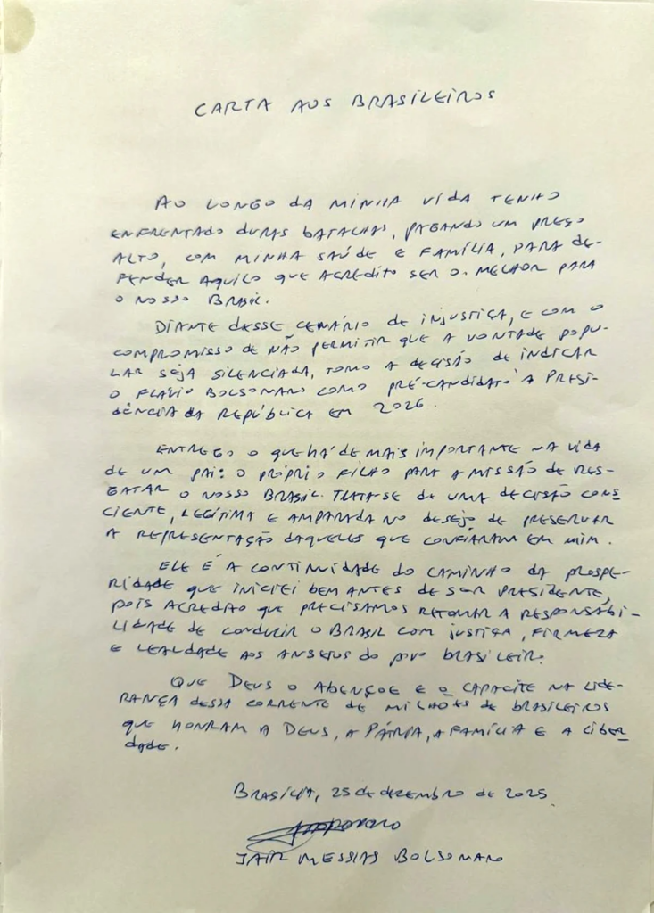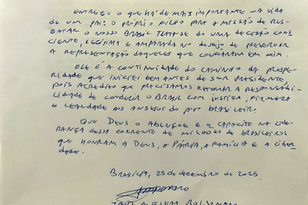 “Ao longo da minha vida tenho enfrentado duras batalhas, pagando um preço alto, com minha saúde e família, para defender aquilo que acredito ser o melhor para o nosso Brasil”, inicia Bolsonaro na carta, que foi lida por Flávio para jornalistas. “Diante desse cenário de injustiça, e com o compromisso de não permitir que a vontade popular seja silenciada, tomo a decisão de indicar o Flávio Bolsonaro como pré-candidato à Presidência da República em 2026”, segue ele.