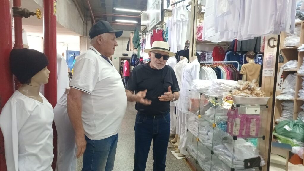 Outra loja visitada foi a do senhor João, que ocupa boxes voltados à venda de roupas brancas. O estabelecimento oferece camisas, blusas, calças, jalecos e outros itens nessa cor.