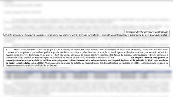 O g1 teve acesso a documentos da Secretaria de Saúde do Distrito Federal (SES-DF) que apontam ser “imprescindível e urgente” a contratação de três a quatro neonatologistas para recompor a carga horária no HRC.